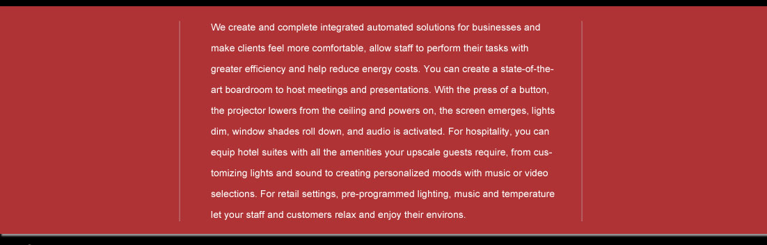 We create and complete integrated automated solutions for businesses and make clients feel more comfortable, allow staff to perform their tasks with greater efficiency and help reduce energy costs. You can create a state-of-the-art boardroom to host meeting and presentations. With the press of a button, the projector lowers from the ceiling and powers on, the screen emerges, lights dim, window shades roll down, and audio is activated. For hospitality, you can equip hotels with all the amenities your upscale guests require, from customizing lights and sound to creating personalized moods with music or video selections. For retail settings, pre-programmed lighting, music and temperature let your staff and customers relax and enjoy their environs.